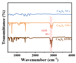 Nello spettro FT-IR dei Cu9S5 SNW, come mostrato nella Figura 3, è stato osservato un significativo fenomeno di spostamento verso il rosso rispetto ai Cu9S5 NW, indicando l'interazione elettronica tra Cu e S. I picchi caratteristici dei campioni di Cu9S5 NW e Cu9S5 SNW a 2916 cm-1 e 2846 cm-1 possono essere attribuiti alla modalità di vibrazione di stiramento del metilene (- CH2-) nel dodecantiolo, mentre il picco caratteristico a 1471 cm-1 corrisponde alla modalità di vibrazione di flessione del legame C-H.