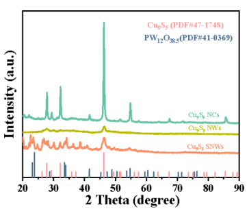La larghezza della metà del picco del piano cristallino di Cu9S5 SNW (001) è significativamente maggiore di quella delle altre due forme di campioni. Secondo la formula di Scherrer, minore è la dimensione del grano, maggiore è la larghezza del mezzo picco del picco di diffrazione corrispondente. Al contrario, maggiore è la dimensione delle particelle, più nitida sarà la metà della larghezza del picco di diffrazione. A causa della dimensione su scala sub nanometrica (0,95 nm) del campione di Cu9S5 SNW e del fatto che il campione presenta una struttura a cella singola senza un piano cristallino completo, la larghezza di metà picco è significativamente maggiore, mentre la larghezza di metà picco (001) di Cu9S5 SNW è maggiore.