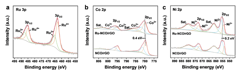 La tecnologia XPS può analizzare in modo approfondito la composizione elementare, gli stati chimici e la struttura elettronica delle superfici del catalizzatore. Quando la superficie del catalizzatore viene irradiata con raggi X, gli elettroni degli atomi superficiali vengono eccitati. Rilevando l'energia e la quantità di questi fotoelettroni, possiamo determinare il tipo e il contenuto dell'elemento, nonché l'ambiente chimico in cui si trova l'elemento. Ad esempio, quando si studiano catalizzatori metallici supportati, XPS può determinare con precisione la forma del metallo sulla superficie del supporto, se si tratta di un elemento metallico o di un ossido metallico, e i cambiamenti nel suo stato di ossidazione. Questo è molto importante per comprendere l'attività e il meccanismo di disattivazione del catalizzatore. Come mostrato nella Figura 5, XPS è stato utilizzato per dimostrare la composizione e gli stati di valenza degli elementi Ru, Co e Ni. Gli spettri fini XPS di elementi specifici nel campione sono stati utilizzati per determinare lo spostamento positivo/negativo dell'energia di legame, indicando l'esistenza di interazioni elettroniche.