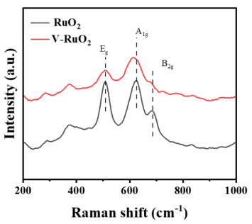 Come mostrato nella Figura 4, lo spettro Raman di V-RuO2 (RuO2 drogato con V) è coerente con quello di RuO2, senza altri picchi unici, esclusa la generazione di V2O5. Il doping V sposta la modalità A1g di RuO2 a numeri d'onda inferiori, indicando che l'introduzione di V influenza in modo significativo la sua struttura reticolare e l'ambiente di legame chimico (che può provocare posti vacanti di ossigeno o difetti locali), alterando così la sua struttura elettronica; Lo spostamento a sinistra del picco A1g riflette l'interazione tra gli atomi di V e il reticolo di RuO2, indicando che il drogaggio di V modula la simmetria locale e le caratteristiche di lunghezza dei legami di RuO2.